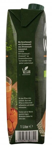 Karottensaft aus direkt gepressten Karotten mit einem Zusatz Bio Zitronensaft zur Ansäuerung.